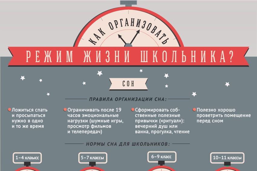 В 1–4 классе — 10–10,5 часа, 5–7 классы — 10,5 часа, 6–9 классы — 9–9,5 часа, 10–11 классы — 8–9 часов. Первоклассникам рекомендуется организовывать дневной сон продолжительностью до 2 часов.