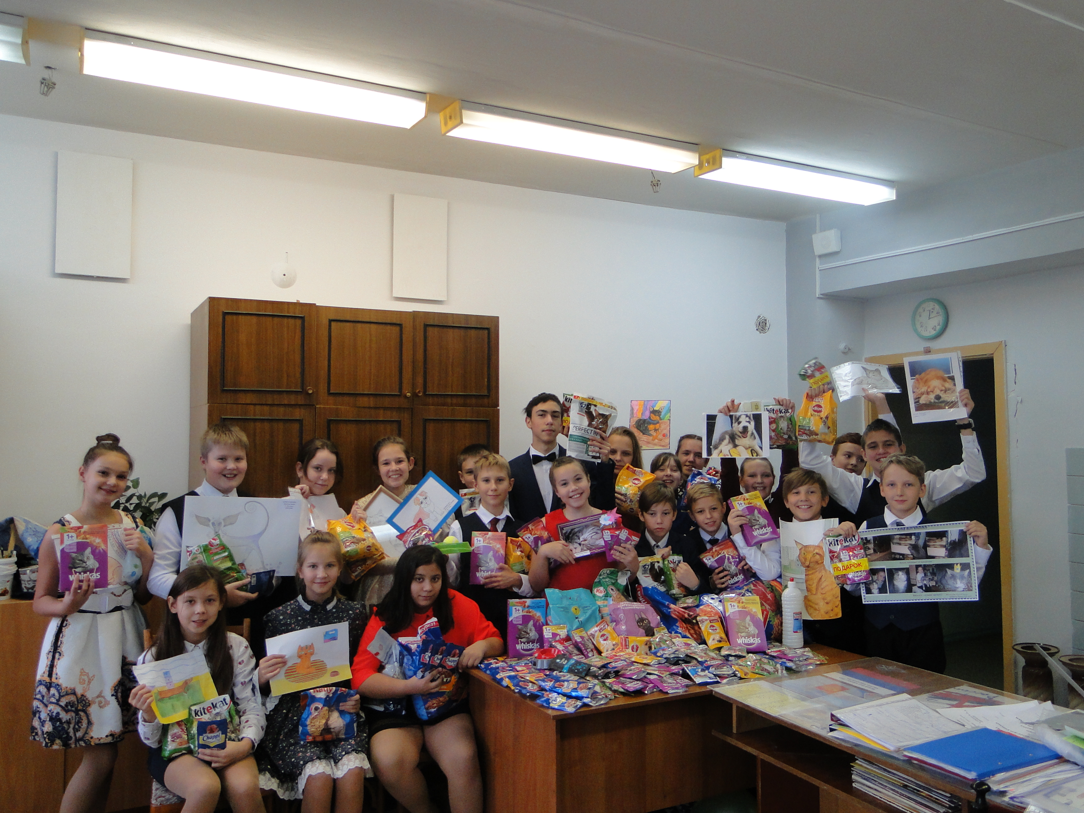 Инициативу 5 В класса поддержали учащиеся других классов и начиная со следующего дня дети стали нести рисунки своих питомцев, корм и необходимое для приемника «Подари жизнь». В итоге собрали 70 кг корма для собак и кошек.