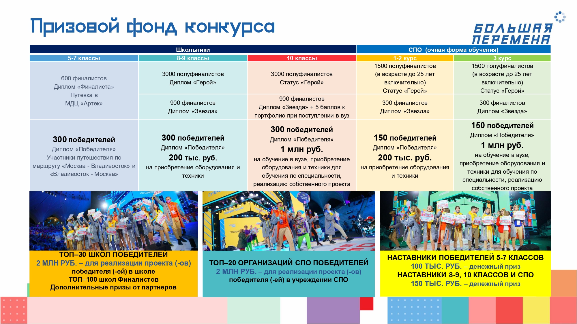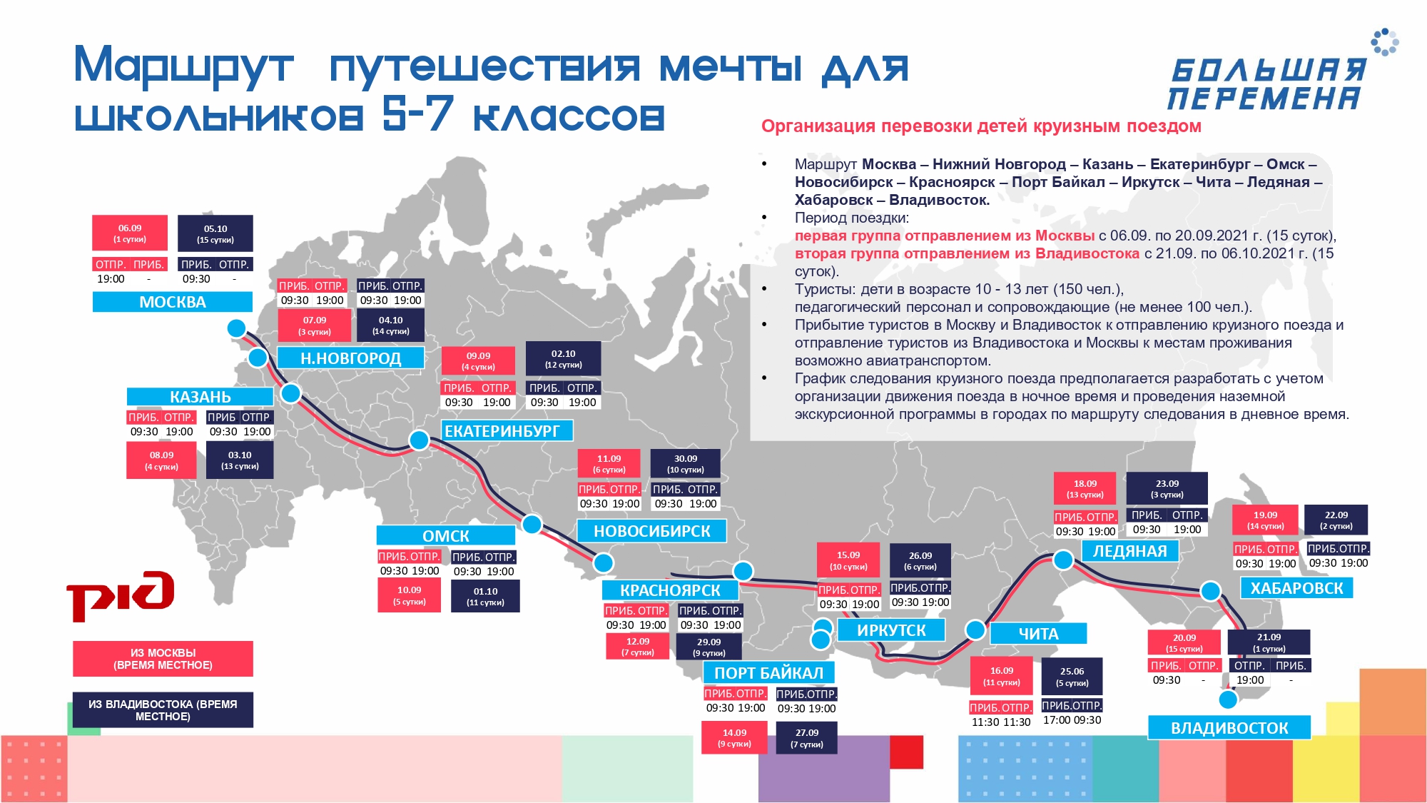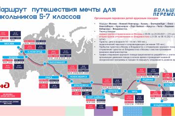 300 победителей смогут отправиться в «путешествие мечты» на поезде «Большой перемены» от Москвы до Владивостока и обратно. По маршруту следования поезда предусмотрены остановки, образовательная и экскурсионная программа. Помимо Москвы и Владивостока ребята подробно познакомятся такими городами, как Нижний Новгород, Казань, Екатеринбург, Омск, Новосибирск, Красноярск, Иркутск, Чита, Хабаровск, а также побывают на космодроме «Восточный».