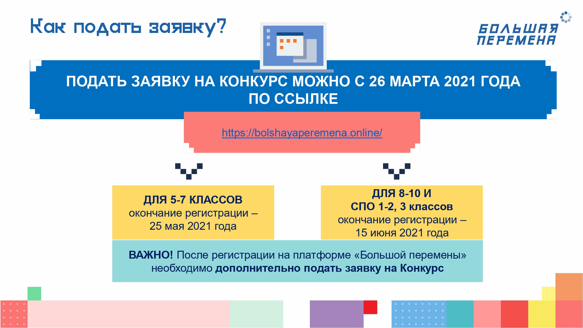 Мы рады сообщить о том, что в этом году в конкурсе "Большая перемена" могут принять участие школьники 5-7 классов.