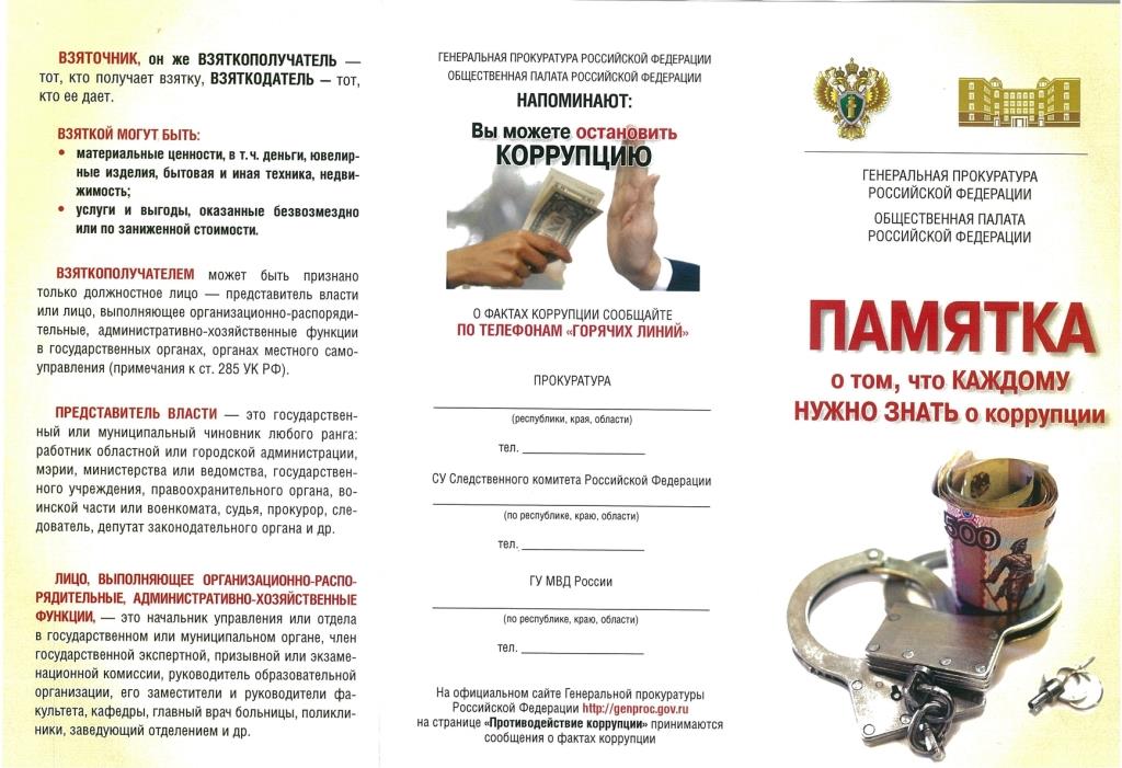 - Генеральной прокуратурой Российской Федерации разработан ряд тематических информационно-разъяснительных материалов, направленных на повышение уровня правосознания граждан – памятки и буклеты с пояснением законодательства в сферах, имеющих повышенный коррупционный риск, и обоснованием целесообразности выбора некоррупционного поведения (скачать)
